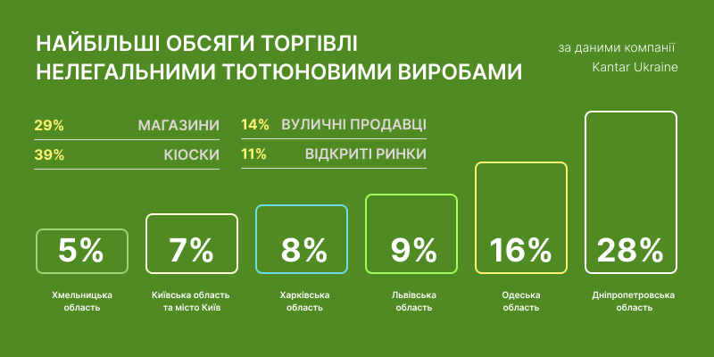 Найбільші обсяги торгівлі нелегальними тютюновими виробами традиційно фіксуються у шести областях, які разом формують 73% ринку такої продукції: Дніпропетровська – 28%, Одеська – 16%, Львівська – 9%, Харківська – 8%; Київ і Київська обл. – 7%, Хмельницька – 5%.